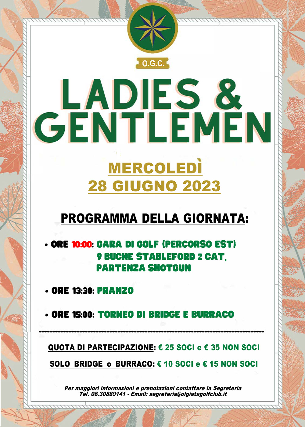 Ladies & Gentlemen Il 28 Giugno torna il LADIES & GENTLEMEN, giornata che da sempre unisce golf, carte e pranzo conviviale. Ricordiamo che questa giornata dà la possibilità ai neofiti di cimentarsi in campo per la prima volta su 9 buche e che non è necessario partecipare a tutti gli eventi della giornata.