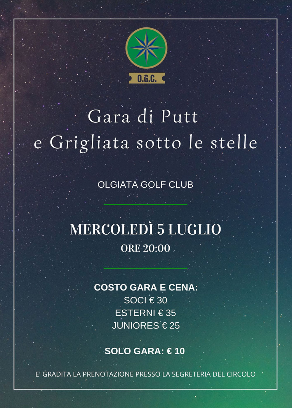 Gara di Putt e Grigliata sotto le stelle Mercoledì 5 Luglio - ore 20.00 COSTO GARA E CENA Soci €30 Esterni €35 Juniores €25 Solo Gara €25 E' gradita la prenotazione presso la segreteria del circolo.