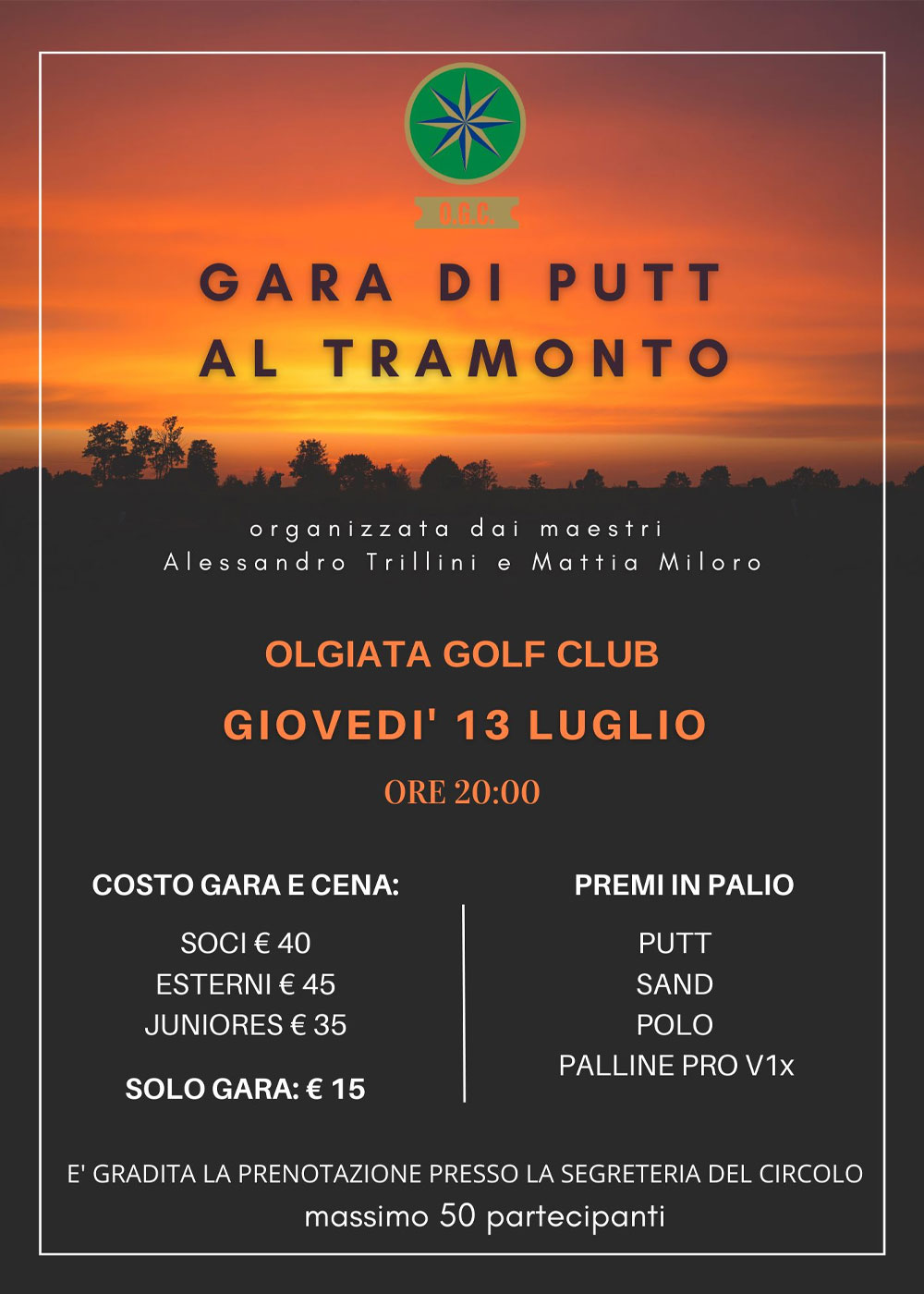 Gara di Putt al Tramonto Visto il successo della scorsa Gara di Putt e grigliata sotto le stelle, i nostri maestri Alessandro Trillini e Mattia Miloro propongono un format simile Giovedì 13 Luglio, con in palio fantastici premi.